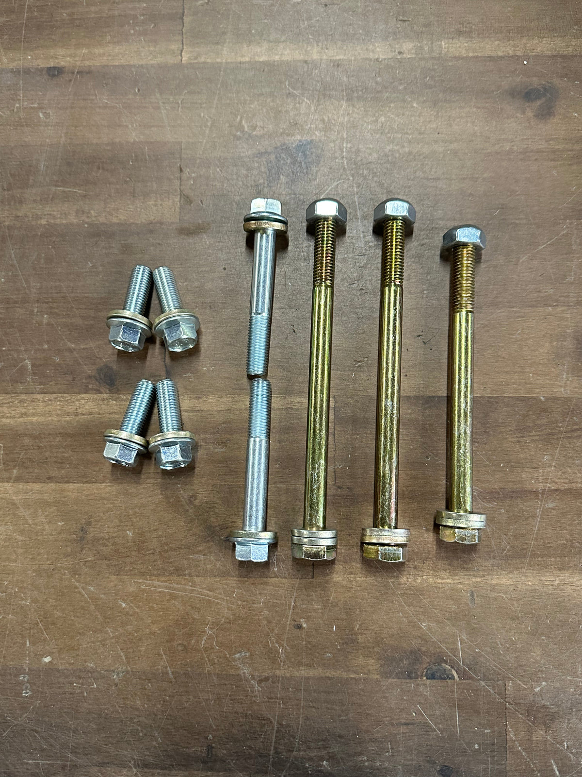All bolts are grade 10.9 and either yellow zinc or clear zinc coated to prevent rust and corrosion over time. All of the washers used are high quality hardened with high carbon washers, and the nuts when used are all metal top locking stover nuts which are shown to hold their torque longer than almost any other type of nuts. They will hold their torque much better than the OEM nuts.