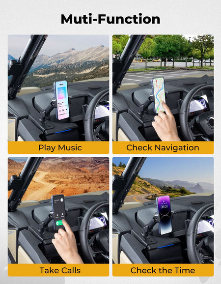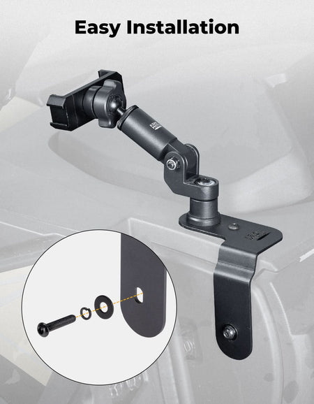 The base is securely mounted on the left side of the dashboard, ensuring it doesn't block your view. The ZForce 950 Trail holder can rotate 360° in any direction, allowing you to easily adjust your phone to the perfect angle.