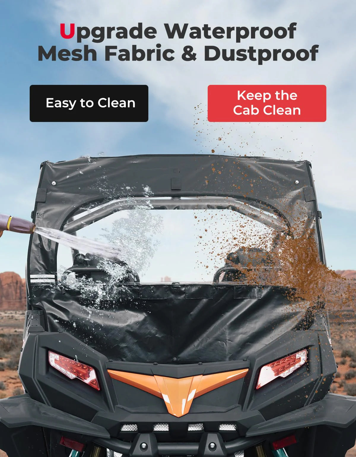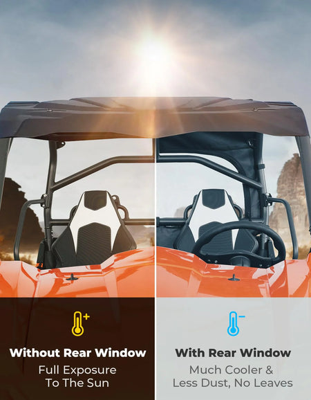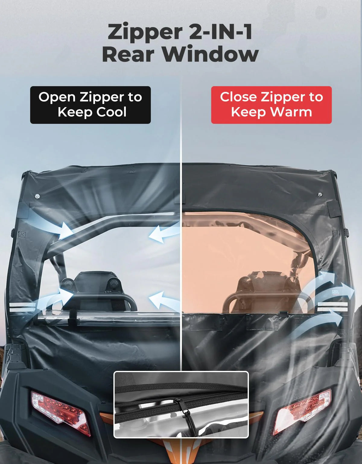 The double zipper design of our Rear Soft Window allows for smooth operation, while the fabric covering ensures protection against mud and rain. hook-and-loop straps are also included to secure the transparent window and enhance airflow. Easily roll down the transparent window for convenient access.