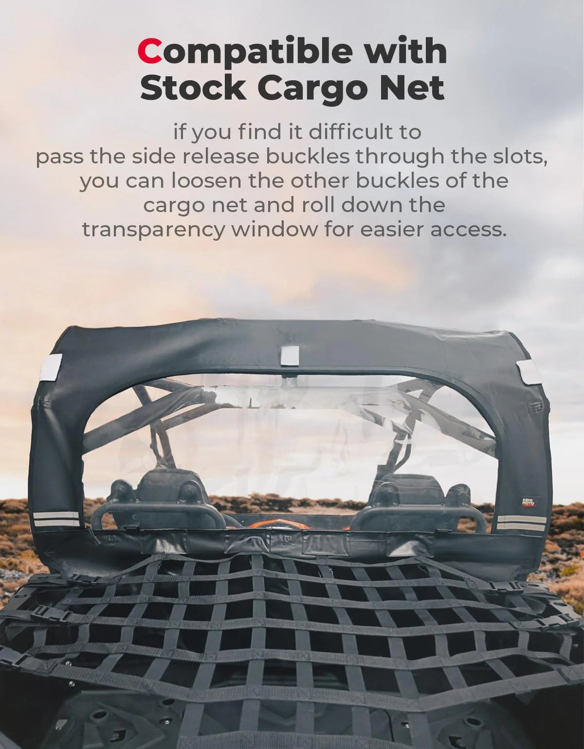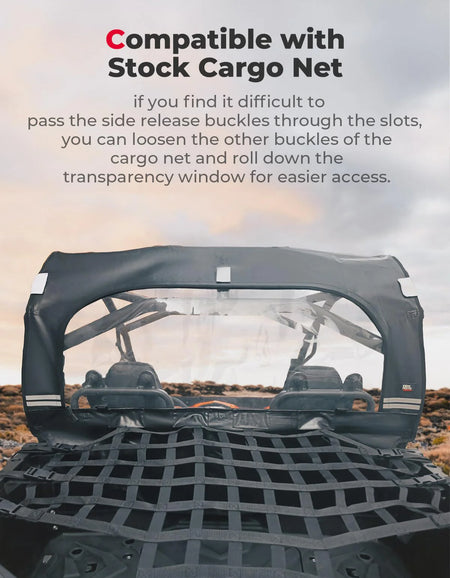 Engineered to seamlessly match your vehicle's original frame, this Rear Soft Windshield integrates effortlessly with factory cargo nets and soft roofs, ensuring a perfect fit and ease of use.