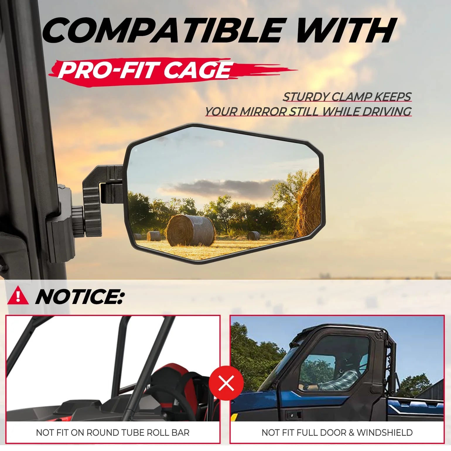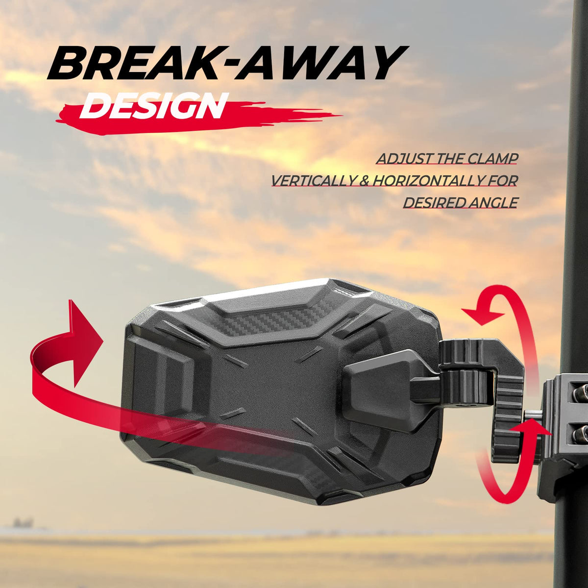 Kemimoto utv mirrors feature 3-axis rotation to allow maximum adjustability. Ball-joint connector on the mirror bracket allows smooth and toolless rotation to any desired angle and style. 2 axes on the mounting clamp provide vertical & horizontal adjustments.