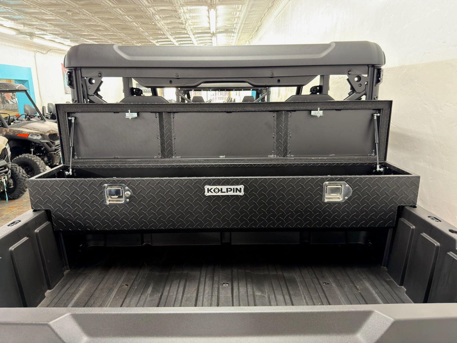 - UTV bed box constructed of 15-gauge diamond plate aluminum