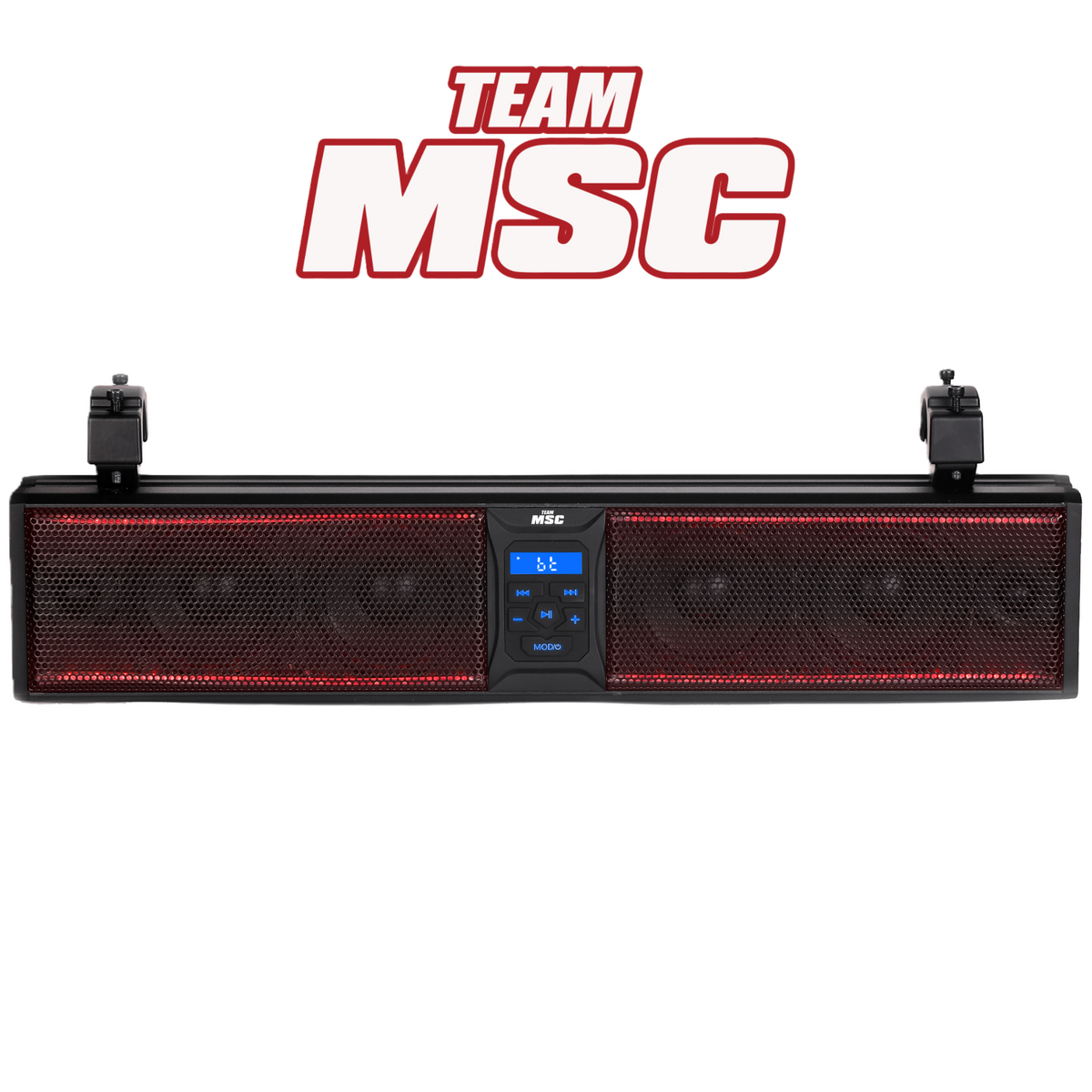 Our TEAM MSC sound bar with RGB lights comes with all you need, and you don't need to prepare anything. It includes adjustable mounting brackets, the 33" soundbar, a 3.5mm AUX input, a USB jack, wireless remote control, a power extension adaptor, a cigarette lighter, a user manual, and installation tools. Take your music on the trails with the TEAM MSC RGB SOUND BAR!