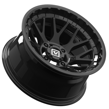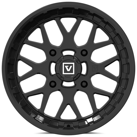 Clean split eight spoke mesh design with debossed V logo. Offroad inspired and reinforced inner lip. Engineered to exceed SAE 2530 safety specifications. Bolt-on shorty center cap with embossed white logo.